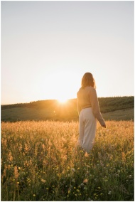 A tranquil moment of a woman in a summer meadow at sunset, capturing natural beauty and serenity.