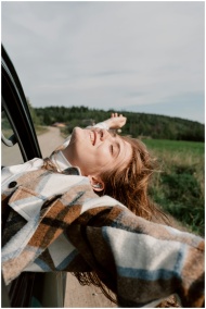 Joyful young woman leans out of car window, embracing freedom during a road trip.