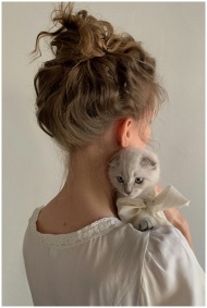 Young woman in Paris holds a kitten with a bow, sh