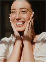 Close-up portrait of a joyful woman smiling brightly with natural lighting.