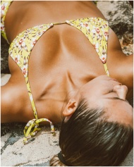 Woman in floral bikini sunbathing on rocks, enjoyi