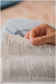 A close-up photo capturing a hand holding open a Bible, focusing on text.