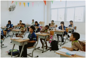 Students attentively participating in a diverse classroom lesson.