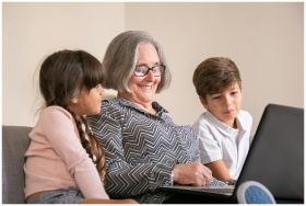 Cheerful grandmother bonding with grandchildren while using a laptop indoors.