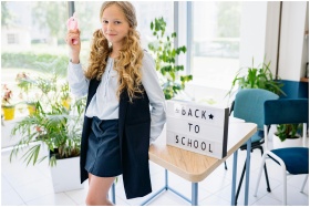 A cheerful girl holding a toy stands beside a 'Back to School' sign indoors.