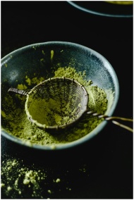 Close-up of matcha powder in a ceramic bowl with a bamboo sieve on dark background.