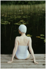 Woman in swimsuit and cap sitting on dock by a ser