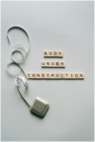 Inspiring fitness concept with 'Body Under Construction' in Scrabble tiles and a tape measure.