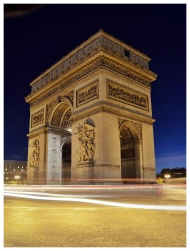 Elegant night shot of the Arc de Triomphe in Paris with light trails underneath, capturing its monumental beauty.