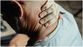 Man with neck pain holding his neck in discomfort,