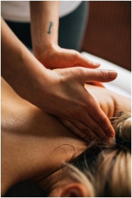 Hands performing massage on a woman in a serene indoor setting, promoting relaxation and self-care.