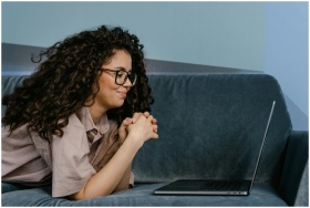 Woman with glasses lying on a sofa working remotel