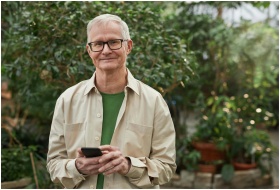 Senior man standing in a greenhouse garden, smiling while using a smartphone. Natural sunlight.