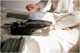 Relaxing morning scene with a close-up of a vintage record player and a person sitting on a bed in pajamas.
