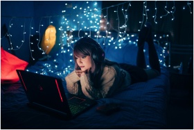 A young woman in a cozy room, wearing headphones and using a laptop, surrounded by warm fairy lights.