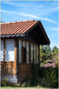 A cozy rustic wooden cottage with a tiled roof in