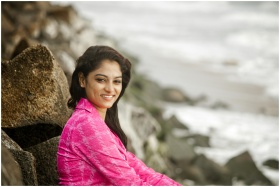 Woman in a vibrant pink outfit smiles sitting on rocks near the beach.
