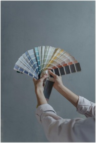 Hands displaying a fan of paint color swatches aga