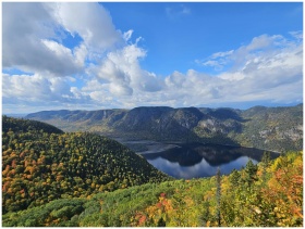 Breathtaking autumn landscape overlooking a serene lake in Saguenay, Québec, Canada.