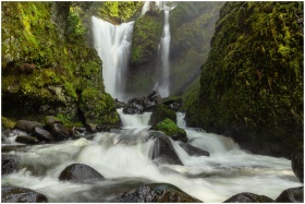 Beautiful waterfall cascading over mossy rocks in