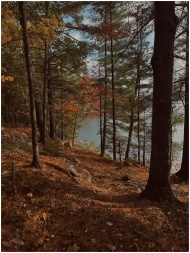 Peaceful autumn forest with colorful foliage by a calm lake, perfect for nature lovers.