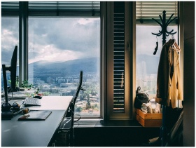A contemporary office setting with a stunning mountain view through large windows and stylish furnishings.