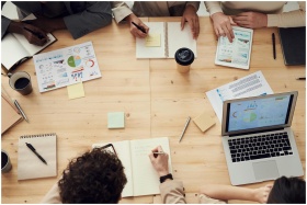 Business professionals in a collaborative team meeting, discussing charts and plans with laptops and notebooks.