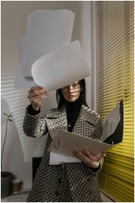 A stylish businesswoman stands indoors, tossing sheets of paper into the air with determination.