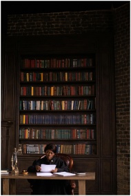 Black female judge reading papers at desk in office with bookshelves.
