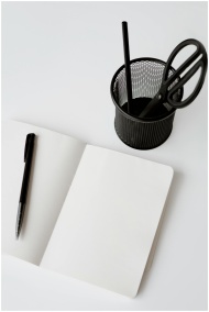 A minimalist workspace featuring an open notebook, pen, and pen holder on a white surface.