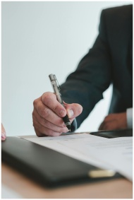 A businessman in a suit signing a contract in an office setting, emphasizing professional context.