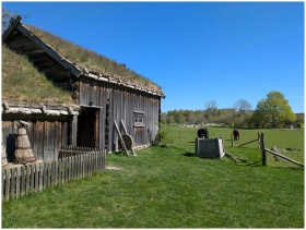 A picturesque rural scene with a wooden farmhouse