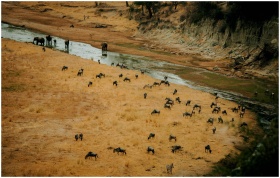 Elephants and wildebeests migrating by a river in a dry landscape.