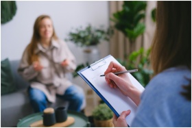 Two women engaged in a therapy session, communicat