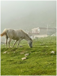 A serene white horse grazing in a mist-covered mountainous landscape, evoking peace and nature's beauty.