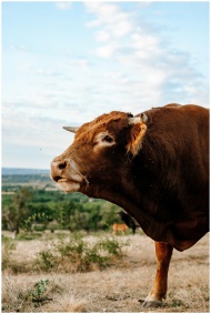 A close-up of a brown bull in a serene Spanish lan