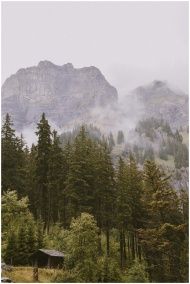 Tranquil scene of the Swiss Alps with misty mountains and lush pine forests.