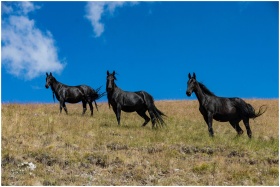 Three black horses galloping freely in a rural field under a vibrant blue sky.
