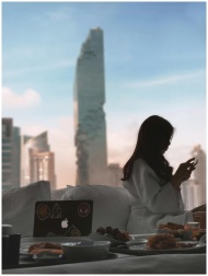 A serene morning scene of a woman relaxing with breakfast in a luxurious Bangkok hotel room.