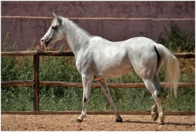 Elegant white horse captured in an outdoor corral,