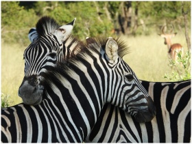 Close-up of two zebras embracing in South Africa with antelopes in the background.
