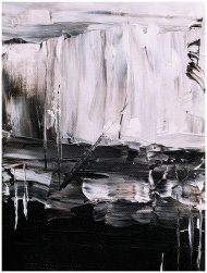 Bold and expressive abstract painting in monochrome tones with fluid patterns.