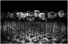 An artistic display of wooden masks on poles, set in a dimly lit theater.