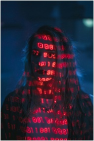 A woman with red binary code projected on her face, signifying technology and cybersecurity.
