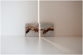 Minimalist photo of Michelangelo's Creation of Adam with dramatic lighting and shadows.