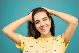 A cheerful woman in a yellow shirt poses against a teal background.