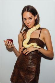 Woman with a snake around her neck holding a red apple, wearing an animal print dress.