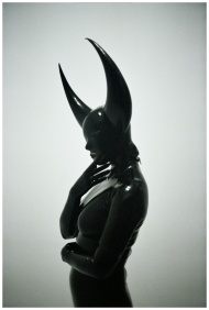Silhouetted figure in a glossy black latex suit with large horns in profile.