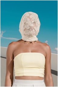 Elegant portrait of a woman outdoors wearing a lace veil with vibrant blue sky background.