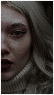 Close-up of a woman's face with tear, expressing deep emotion and sadness.
